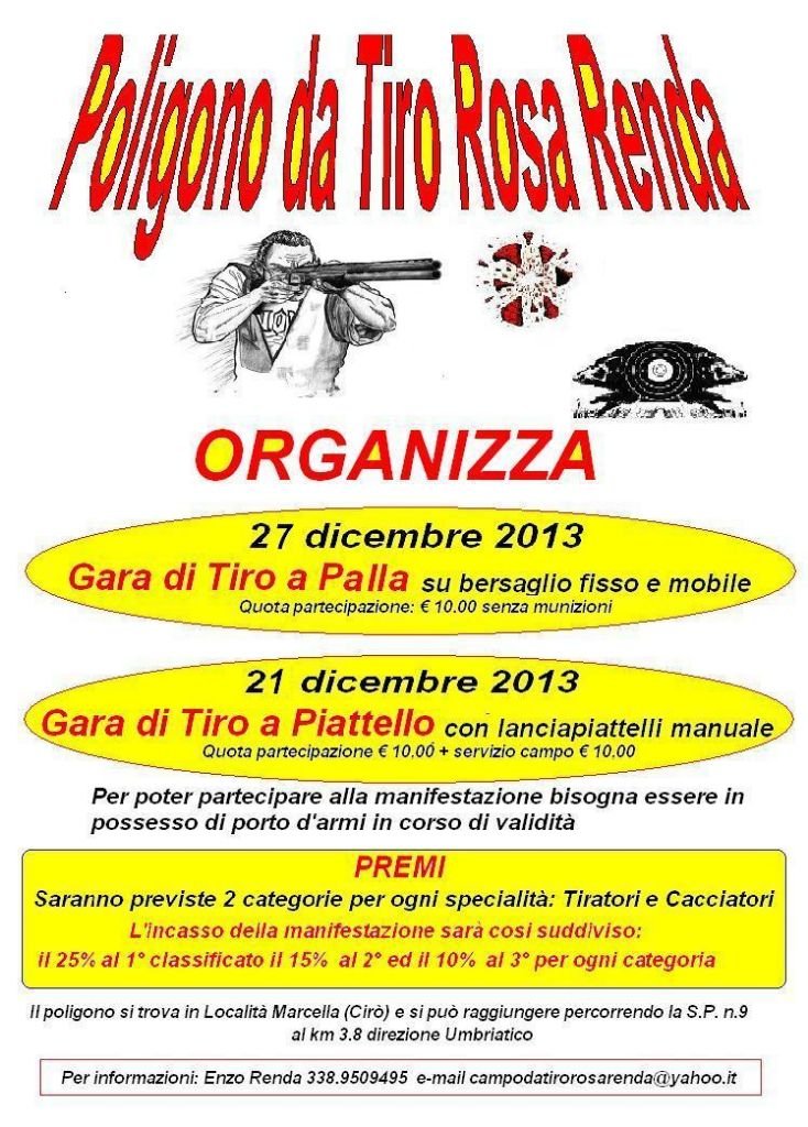 GARA DI TIRO A PIATTELLO E PALLA DICEMBRE 2013 A CIRò (kr) GIORNO 21 DICEMBRE 2013 MANIFESTAZIONE DI TIRO A PIATTELLO GIORNO 27 DICEMBRE 2013 MANIFESTAZIONE DI TIRO A PALLA Lascia un commento Annulla rispostaIl tuo indirizzo email non sarà pubblicato. I campi obbligatori sono contrassegnati *Commento * Nome * Email * Sito web Salva il mio nome, email e sito web in questo browser per la prossima volta che commento. Δ